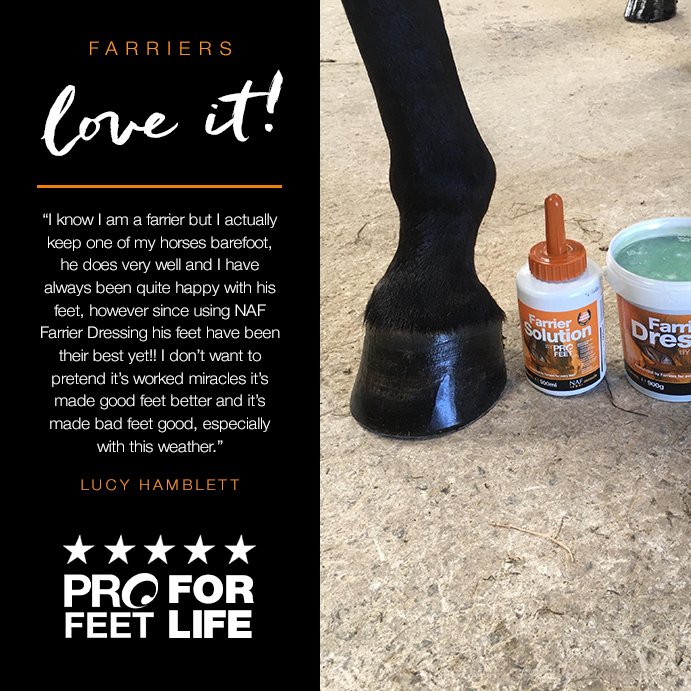 “We are delighted to be working with NAF and are now supplying the PROFEET range to our customers. PROFEET is a well-known name in hoof care and we are now able to offer their benefits to our farrier base to support their shoeing process. We are looking forward to seeing where this relationship takes our Hoof Care & Soundness brand, and will enjoy the input of nutritional experts into modern hoof care systems.”