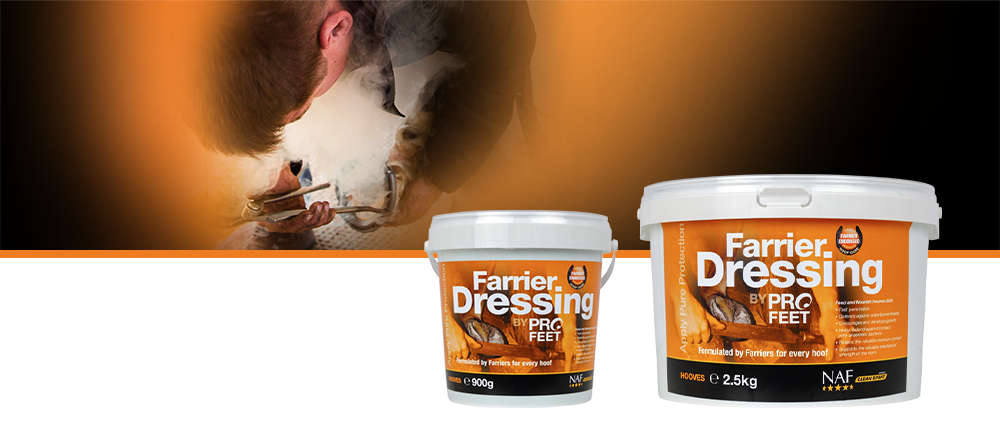 Formulated by farriers for every hoof. Ideal for maintaining sound hooves, encouraging growth and healthy horn all year round. Recommended for those with poor hoof quality or when ridden days are lost due to the aged old saying, ‘No foot, No horse.’ A hoof dressing rich in emollients providing a nourishing blend high in stearic, oleic and other fatty acids. Expertly blended to enable deep penetration into the horn and help prevent premature cracking and drying, as well as protecting the hoof capsule from the outside in. Ultimately helping to defend the hoof from waterborne infectious threats. A farrier’s aid when nailing on. Helps form a natural barrier making it difficult for unwanted bacteria to travel up the hoof wall and create an anaerobic environment. PROFEET Farrier Dressing gives farriers hooves to work with and helps each horse stamp out bad feet.